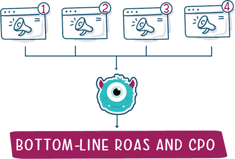 Example: You have 2 Shopify stores and 3 custom e-shops with mostly the same products. In order to see your bottom-line results, you had to patch up numbers from 5 different sources to get an approximate idea of your success. ROAS monster can consolidate those numbers and serve you bottom-line ROAS and CPO - merged metrics you wouldn't be able to calculate on your own.